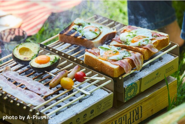 デンマーク・CASUSGRILL社の「クラフトグリル」は、ダンボール、竹炭、火山石、竹などすべて天然の素材でできた使い捨てグリル。組み立てて、四隅の竹炭に着火するだけで約5分でセットアップ。調理時間も60分と、本格的な調理が楽しめます。