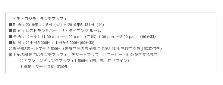 さらに、小さなお子さまもご一緒にゴジラの世界観をお楽しみいただけるよう、ゴジラ生誕65周年を記念して誕生したキャラクター「ちびゴジラ」が活躍する『がんばれ ちびゴジラ」の絵本をお土産につけた、キッズプランもご用意いたしました。2019年のイチゴの季節は「キング・オブ・ストロベリーモンスターズ」になりきって、「イチ・ゴジラ」ランチブッフェをどうぞお楽しみください。