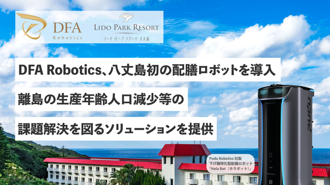 飲食店DXを推進するロボティクスソリューションカンパニーである株式会社DFA Robotics(本社:東京都渋谷区 代表取締役社長:波多野昌昭)は、提携するPudu Robotics社(本社:中国深セン、日本法人Pudu Robotics Japan 株式会社 代表取締役社長:張涛)が提供する、下げ膳特化型の配膳ロボット「Hola Bot(ホラボット)」を、東京・八丈島のリゾートホテル『リードパークリゾート八丈島』にて島内初(※)導入いたしました。導入により、レストラン内の下げ膳のためにスタッフが移動していた距離を大幅に削減し、オペレーションの効率化やスタッフの身体的負荷削減を実現します。