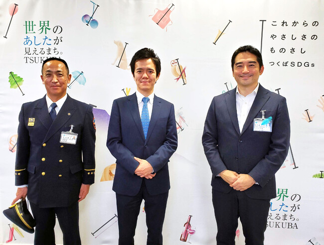 右からつくば市長・五十嵐立青氏、当社代表取締役医師・園生智弘、つくば市消防長・木村勝平氏