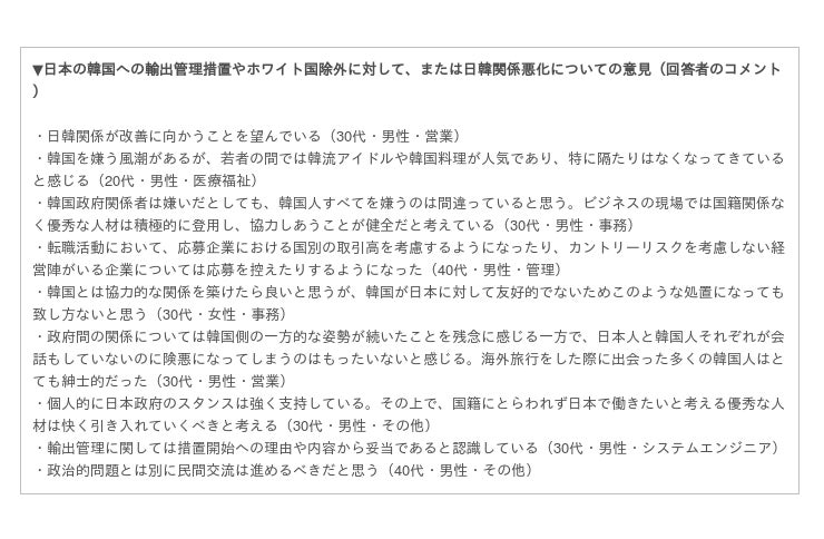 今回、日本の韓国への輸出管理措置やホワイト国除外に対して、または日韓関係悪化について、対象者に自由回答で意見を求めた結果、さまざまな意見が挙がりました。今回はその一部をご紹介します。