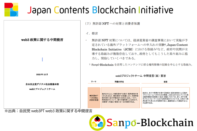 自民党web3PTの中間提言におけるSanpō-Blockchainを活用したコンテンツに係る権利情報の記録を中心とする一般社団法人JCBIの取組みの取り上げ