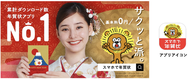 「スマホで年賀状(TM)」は、年賀状の作成から印刷、配送まで年賀状づくりのすべてがカンタンにできるスマートフォンアプリです。パソコン版「ネットで年賀状」のアプリ版としてリリースされた2014年から2023年の10年間で累計650万ダウンロードを達成。スマホひとつでカンタンに年賀状をつくることができる点が支持され、年賀状アプリではNo.1※の王道サービスです。購入者の8割強が女性、中でも特にママ層からの人気が高い年賀状作成アプリの決定版と言えます。