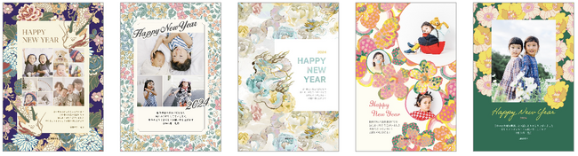 1875年創業、イギリス・ロンドンの中心部にある老舗百貨店「リバティ」などを展開するリバティ社のファブリックブランドから、厳選のデザインが年賀状となって「スマホで年賀状(TM)」に今年も登場です。リバティ社のデザインチームが生み出すリバティプリントのコレクションの中でも特に人気が高い柄と、新作柄を含む全29種類70デザインがラインナップ。さらに2024年の干支「辰」の新作からは6柄を採用しています。水彩タッチからグラフィックデザイン調の柄まで、リバティらしい繊細なタッチをそのまま年賀状デザインにしてお届けします。豊かな歴史や伝統を感じられる厳選のリバティプリントを使った年賀状デザインで新年のご挨拶をぜひ。