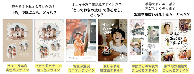 “年賀状で使いたい色は?”“年賀状でとっておきの1枚の写真を使うなら?”“複数の写真を使った年賀状を作るなら?”「あなたはどっち?」という切り口で、今、まさにおしゃれで使いやすいと思っていただけるようなデザインが合計7種類登場します。使うならどっちかな?という、デザインを選ぶ楽しみも、年賀状づくりを通してぜひご体感ください。