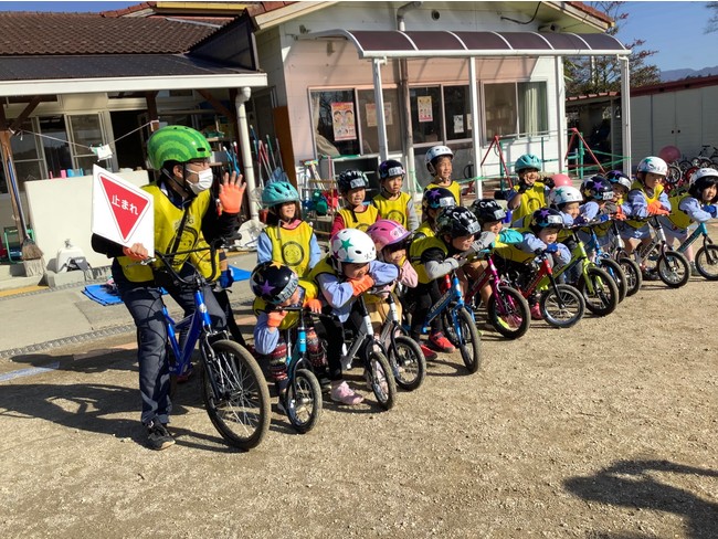 令和3年12月、日野町立保育園、幼稚園、こども園で、全ての5歳児を対象として、自転車の乗り方を体で覚える自転車教室を開催。