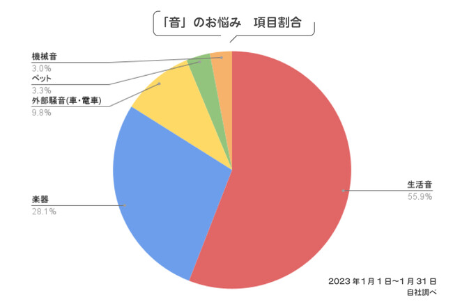 日本の7大公害の一つと言われている「騒音」問題。特にコロナ禍になり、騒音に関する相談件数の伸びは加速化しました。ピアリビングでは、年間13,000件を超えるご相談が寄せられます。直近のデータ(2023/1/1〜1/30、1,015件)によると、全体のご相談のうち55.9%が「生活音」によるお悩みが占めました。