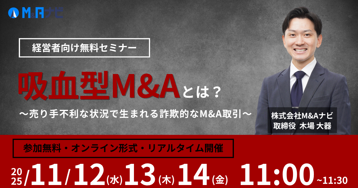 M&Aテクノロジーを展開する株式会社M&Aナビ(本社:東京都品川区、代表取締役:瀧田 雄介、以下「当社」)は、中小企業の経営者向けに吸血型M&Aについて解説するセミナーを2025年11月12日(水)、13日(木)、14日(金)の11時00分から開催いたします。