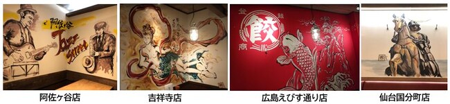 新店が出来るたび、絵師がその店や土地からインスピレーションを得て壁に描いているもので、店舗によってそれぞれ違った味わいのある壁画をお楽しみいただけます。