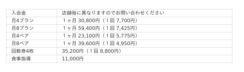パーソナルジムかたぎり塾のパーソナルトレーニングの料金一覧表(公式配布資料より)