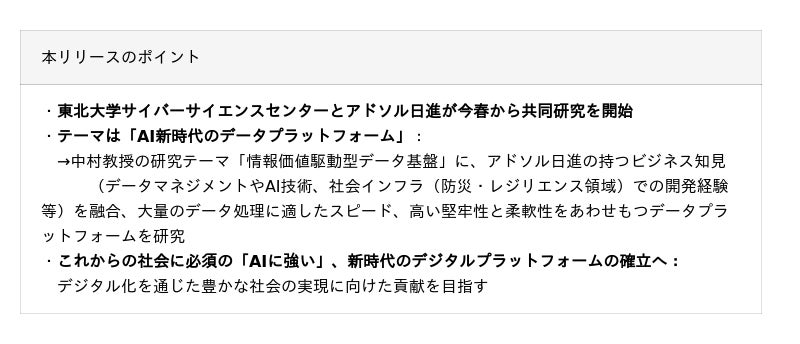 なお、本共同研究は、東北大学サイバーサイエンスセンターデータプラットフォーム研究部の中村隆喜教授と、アドソル日進のデジタル・テクノロジー事業部が中心となって推進いたします。