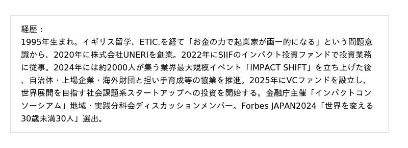 株式会社UNERIは、「起業家の尊厳を回復させ、全てのイノベーターが自分の道を歩める社会をつくる」というミッションの基、2020年に設立された会社です。特に、社会課題系スタートアップの人材育成・企業/行政連携・投資事業を展開しています。2025年4月に投資事業を開始し、UNERI Capitalというファンドを通して投資を実施しています。