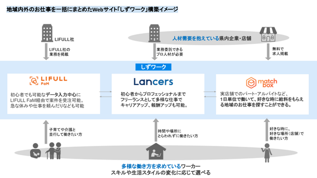 ランサーズはフリーランスマッチングプラットフォーム「Lancers」と連携し、地域内外のお仕事掲載や受注可能な人材を可視化した静岡県人材データベースの構築を行います。また、県内企業と協力体制を築き、オンライン・オフライン問わず働けるように地域内のお仕事ページ「しずワーク」を作成いたします。