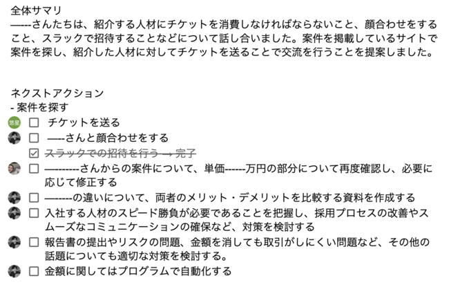 * 以下当社GPT-3内蔵議事録AI CalqTalkで弊社MTGの内容を要約し、ネクストアクションのタスク割り当てを行なった様子。google ドキュメントにて左側は割り当てを行なった人のアイコンが並んでいる。