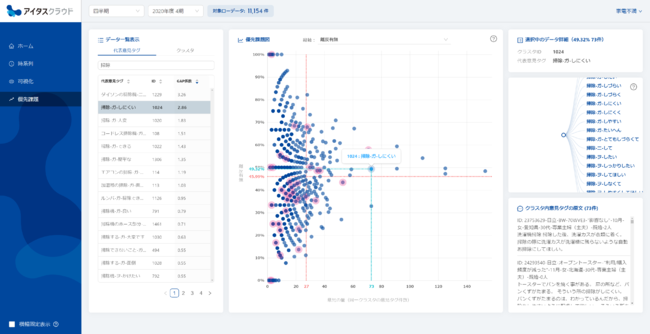 クラスタ(類似する意見のまとまり)を意見の量(横軸)と意見の質(縦軸)で評価する「優先課題図」にて、ユーザーが検索したキーワードを含むクラスタが図上のどの位置にプロットされているかハイライト表示する機能を追加しました。これにより、課題の取りこぼし防止はもちろん、任意の業務テーマを軸とした仮説構築・課題発見を迅速に行っていただくことができるようになります。課題仮説設定や打ち手検討までの時間を大幅に短縮できます。