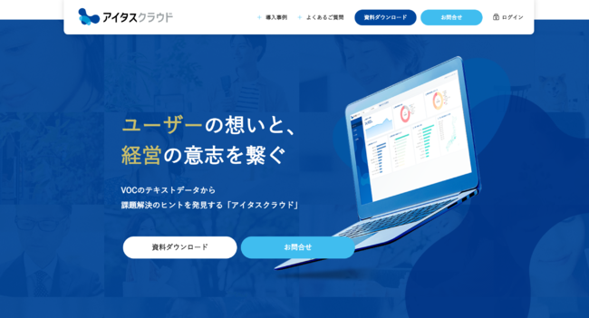 「アイタスクラウド」は最先端の自然言語処理技術を用いた文章解析AI「アイタス」をエンジンとするデータ解析ダッシュボードであり、VOCを可視化するだけでなく、独自のフレームワークにより優先課題を明らかにすることで課題解決のヒントを見つけ、打ち手に繋げることができる業務支援ツールです。