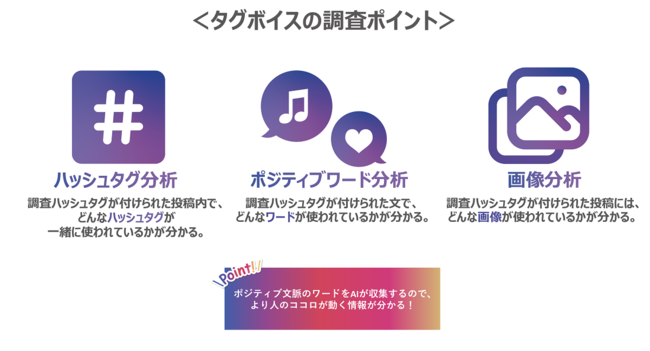 タグボイスでは、アンケートなどの「定量的調査」では知ることが難しく、数値だけでは表しきれない「生活者の興味やトレンドの兆し」を発見することができるので、販促施策のヒントとしてご活用いただけます。