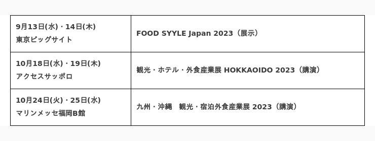 10月に開催される『観光・ホテル・外食産業展 HOKKAOIDO 2023』と『九州・沖縄 観光・宿泊外食産業展』では、CAN EATの代表取締役CEOであり、アレルギー対応食アドバイザーと中級食品表示診断士の資格を有する田ヶ原 絵里が講演を行います。