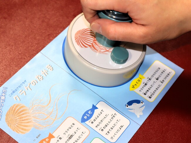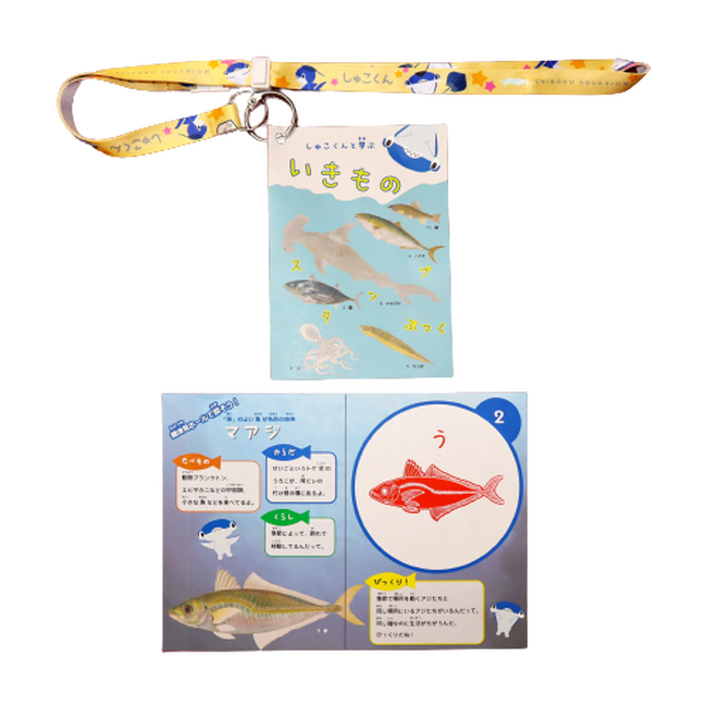 3周年を記念してリニューアルした新しいスタンプブックのタイトルは『しゅこくんと学ぶ いきものスタンプぶっく』です。ネックストラップ付きの冊子で、衆鱗図に描かれた生きものを手がかりに館内5カ所をめぐってスタンプを集める内容です。四国水族館の宣伝隊長シュモクザメの「しゅこくん」がスタンプの生きものについてコメントしていますので、お子様にも分かりやすく、楽しく学べる1冊です。
