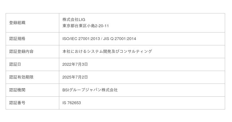 株式会社LIG(本社:東京都台東区、代表取締役社長 兼 CEO:大山智弘、以下 LIG)は、本社におけるシステム開発及びコンサルティングの事業部において社内の情報セキュリティマネジメントシステム(ISMS)の国際規格であるISO/IEC 27001:2013 / JIS Q 27001:2014の認証を取得しました。