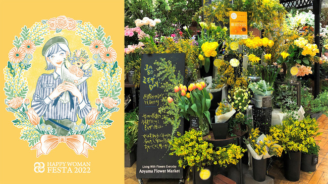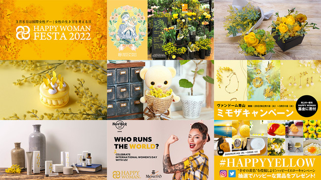 2022年3月4日(金)〜3月8日(?)対象店にて「HAPPY YELLOW」をテーマに、ミモザはじめ??の花々を展開します。対象商品1点ご購入ごとに10円を『HAPPY WOMAN基金』に寄付いただきます。対象商品ご購入のお客様には各日先着で国際女性デーオリジナルポストカードをプレゼント。さらに、3月8日(?)の国際女性デー当日、??いものを身に着けてご来店いただいたお客様に先着で、国際女性デーオリジナルポストカードをプレゼントいたします。