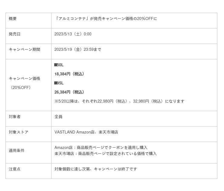 VASTLAND株式会社(本社:兵庫県姫路市/代表:田中悠貴)が運営するキャンプギアブランド「VASTLAND(ヴァストランド)」は、アルミ板厚1.5mmのタフボディを備え、3台までスタッキング可能な「アルミコンテナ」を2023/5/13(土)にAmazon店&楽天市場店で先行発売することを決定しました。また発売を記念して、Amazon店&楽天市場店限定で20%OFFの価格で購入できる「発売キャンペーン」を開催します。