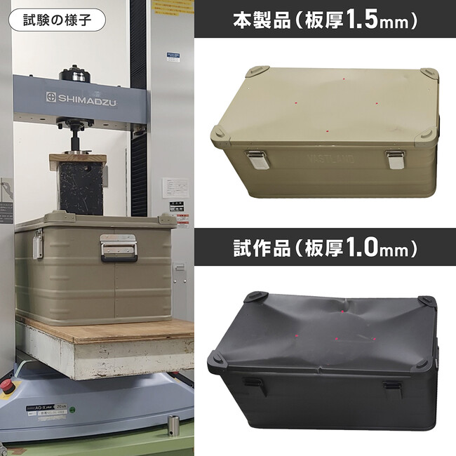板厚1.0mmと1.5mmのアルミコンテナで耐荷重比較試験を実施。