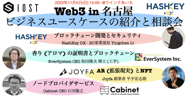 ブロックチェーンの企業サービスの開発や起業家支援など、日本のWeb3産業の発展に貢献する活動を行なってきたIOSTは、アジアをリードするフィンテックソリューションとデジタルアセットマネジメントを提供するHashKey Groupの日本法人であるHashKey DXと、11月5日(日)15:15- @ウインクあいちで、名古屋のDXに取り組む企業や起業希望者、そしてエンジニアや学生を対象とした、ブロックチェーン開発とビジネスユースケースの紹介のイベントを開催します。このイベントでは、AR(拡張現実)やブロックチェーンを活用した収益化に取り組む企業が登壇します。