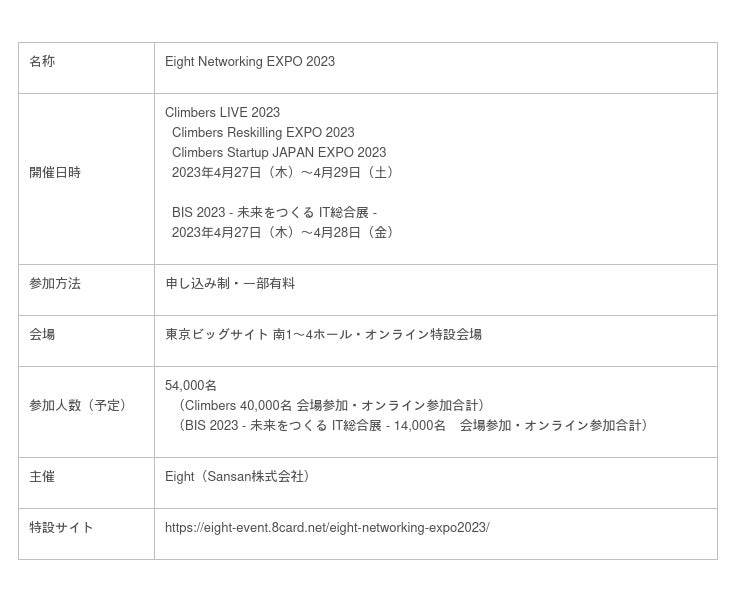 今回新たに開催する「Eight Networking EXPO 2023」は、ビジネスパーソン一人ひとりが出会うべき人や企業と出会い、新たなビジネスやイノベーションを生み出せるよう、人脈づくりに注力したイベントです。 本イベントは、業務を変革するITサービスの総合展示会「BIS (ビジネスIT & SaaS EXPO) 2023 - 未来をつくる IT総合展 -(以下BIS 2023)」や、各界のトップランナーの特別講義を提供するビジネスカンファレンス「Climbers LIVE 2023」をはじめとした、Eightの人気イベントが一堂に会する新たな展示会です。会議形式の参加型カンファレンス、ディスカッションができる交流イベントなど、参加者と出展者、参加者同士が交流できるプログラムを随所に設け、ビジネスマッチングとネットワーキングの機会を創出します。 (主催 Sansan株式会社のHPより引用) ※本展示会の詳細・参加お申込みは下記の特設サイトをご確認ください。 https://eight-event.8card.net/eight-networking-expo2023/