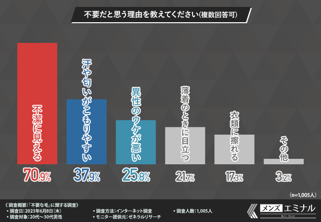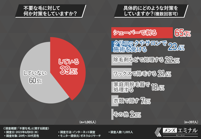そこで今回、メンズ向け脱毛クリニック・メンズエミナル(https://mens-eminal.jp/lp/?refmedia=31073)は、20代〜30代の男性を対象に、「不要な毛」に関する調査を実施しました。
