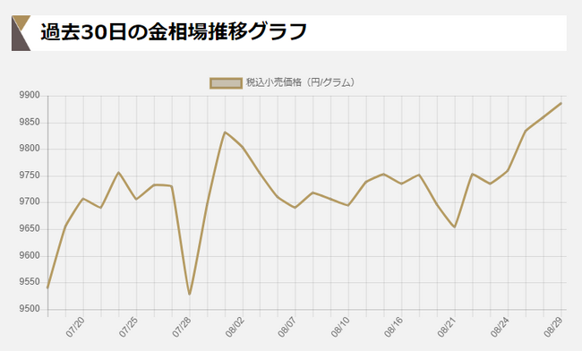 本日、8/30(水)金相場が9,900円を突破しました。8/25(金)に史上最高価格の8,833円を記録し、週明けの8/28(月)からは右肩上がりをみせていた中、勢いは衰えることはなく遂に1gあたり1万円まで残り63円となりました。そこで今回は、相場価格である9,900円ともうじき迎える9月に合わせたキャンペーンを発信致します。