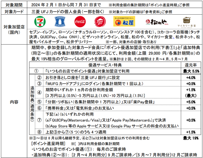 本企画は、「三菱UFJカード」の利用で最大5.5%相当のポイントが貯まる“いつものお店でポイント優遇”に加え、お引き落とし口座への「三菱UFJ銀行」の設定(+4.0%)や「MUFGカードアプリ」へのログイン(+0.5%)等7つの追加特典(下表2.〜8.)で構成。各ポイント優遇加盟店での利用1,000円につき、“最大5.5%”の他に各特典の適用条件に応じて最大13.5%相当のポイントが加算(※2)される仕組みで、合わせて最大19%相当のポイントが貯まるものです。