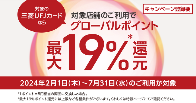 三菱UFJニコスは2月1日から7月31日まで、「三菱UFJカード」の個人会員向け(一部を除く)に、ポイント優遇加盟店での同カードの利用と各種サービスの登録・利用等に応じて最大19%相当(※1)のポイントが貯まる企画を開催、2月1日にその参加登録の受け付けを開始します。