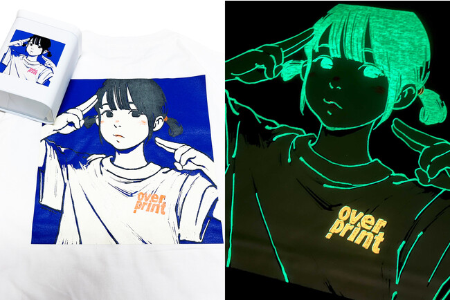 ポップアップを記念に100枚限定で生産した新作のエクスクルーシブアイテム、ポップアートTシャツver.2 グロウインザダークは、バックプリントにあしらわれたcotoh tsumi氏のグラフィックが暗闇で光る加工付き。Tシャツと同じグラフィックのキャニスター缶がケースとして付属する注目のアイテムです。