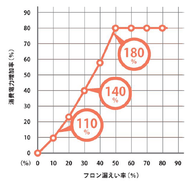 フロンの漏えいは、冷凍冷蔵設備の冷却効率の低下を招き、消費電力量を増加させます。フロンの漏えい率上昇に伴い、消費電力増加率も最大で180%まで上昇します※。 フロンの漏洩を早期に発見し、適切な修理、再充填を実施することで冷却効率の低下を抑え、消費電力を削減することができます。