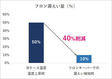 従来、フロンの漏洩は、冷蔵冷凍設備内の温度上昇に伴い発覚し、その時点で既に漏洩量が50%超に至っていると言われています。フロンキーパーでは、液冷媒管に設置した超音波センサーがフロン漏洩時に発生するフラッシュガスを検知することで、漏洩量約10%の段階でフロンの漏洩を早期に発見することができます。これにより、漏洩量そのものを抑制することが可能です。加えて、フロンの再充填に必要なコストも削減することができます。