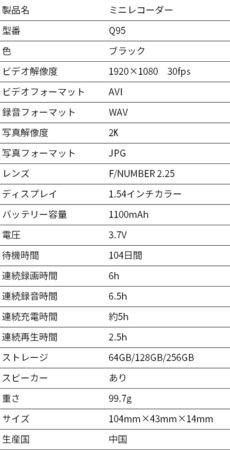 「Q95」はコンパクトながら1100mAhの大容量バッテリーを搭載しており、録音モードは6.5h、録画モードは6h稼働可能です。さらに、待機状態では驚きの104日間持続可能です。さらに、充電しながら使用可能なので、モバイルバッテリーに接続しながら使用すれば記録中の電源切れの心配はありません。