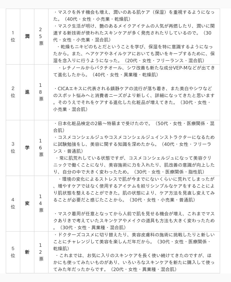 〜アフターコロナの美容意識の変化や化粧品の進化、学習への意欲に伴う多彩な漢字がランクイン〜