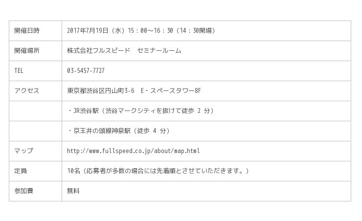 株式会社フルスピード(本社:東京都渋谷区、代表取締役社長:友松功一、以下「当社」)は、改善すべき記事コンテンツの調査方法や、検索エンジン流入に特化した記事コンテンツの改善方法を解説する少人数無料セミナー、「記事コンテンツへの集客が飛躍的に加速!今だから必要なコンテンツ改善手法。〜集客がうまくいかないコンテンツに集客力を持たせるポイントを解説〜」を 2017年7月19日(水)に開催します。