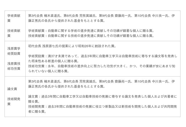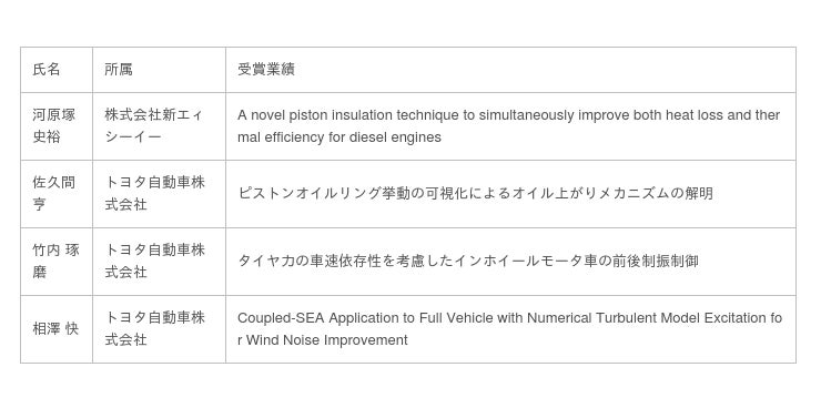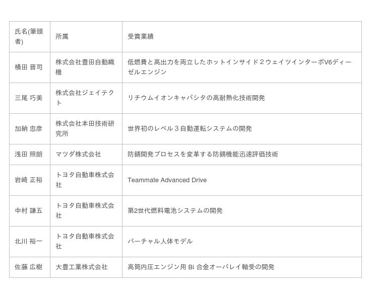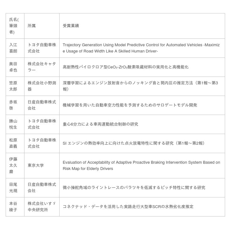 自動車技術会賞は、1951年に自動車工学および自動車技術の向上発展を奨励することを目的として設けられ、自動車技術における多大な貢献・功績に対し贈呈しています。第72回の受賞者は、次の通りです。