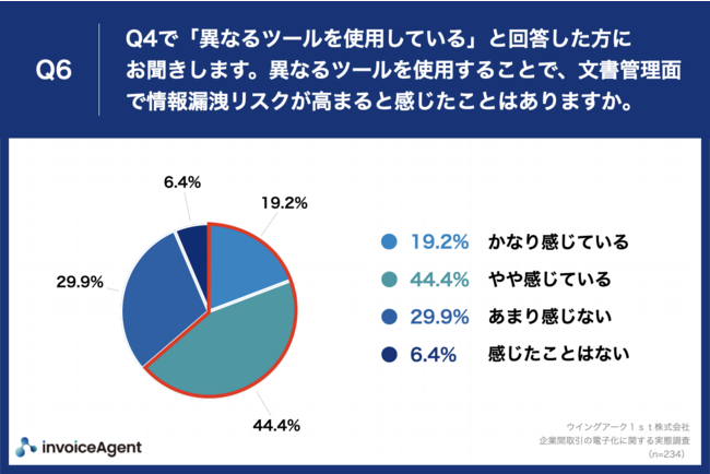 Q4で「異なるツールを使用している」と回答した方に、「Q7.異なるツールを使用することで、文書管理面で情報漏洩リスクが高まると感じたことはありますか。」(n=234)と質問したところ、「かなり感じている」が19.2%、「やや感じている」が44.4%という回答となりました。