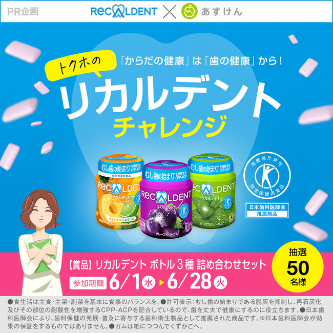 本チャレンジは、期間中7日間、バランスの取れた食事と「あすけん」の食事記録、そして手軽に歯の健康を保つ「リカルデント」の特定保健用食品で、 “丈夫で健康な歯”を目指すキャンペーンです。チャレンジを達成した方の中から抽選で50名様に『リカルデント ボトル3種詰め合わせセット』をプレゼントします。