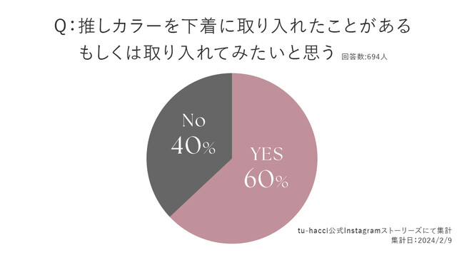 推しカラーについてのアンケートを、tu-hacci公式Instagramで実施。なんと60%の方が"下着に推しカラーを取り入れた事がある・取り入れてみたい"と回答しました。