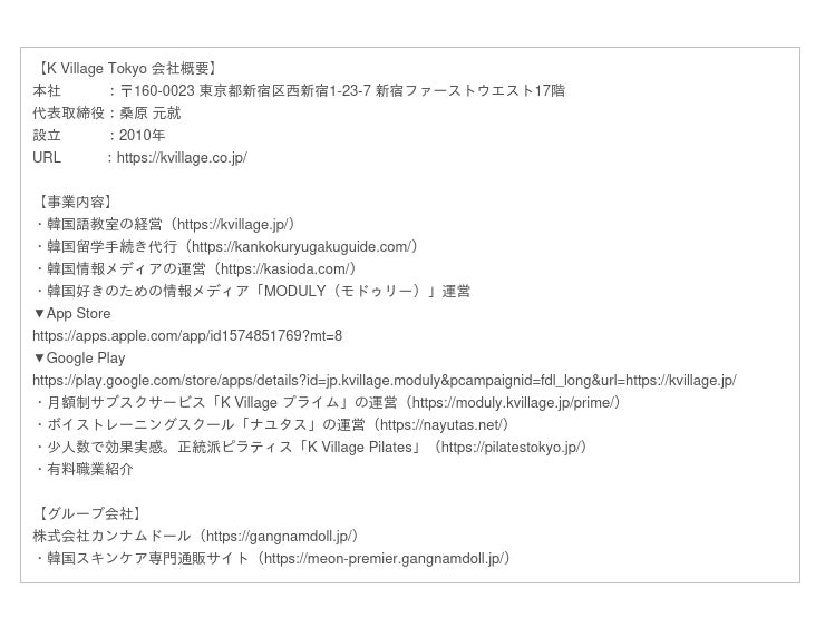 当社は、1万人以上の生徒が通う日本最大の韓国語教室である「K Village韓国語」、約30,000人が利用する韓国情報アプリ「K Village MODULY(モドゥリー)」、LINE・instagramなどSNSフォロワー数合計が約8万人の韓国好きを抱えており、韓国語・日本語が堪能な日韓スタッフ、韓国アプリのローカライズ経験のあるスタッフが在籍しています。