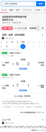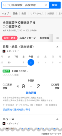 また、フォローしたチームの試合開始情報が「スポナビ野球速報」アプリと「Yahoo! JAPAN」アプリからプッシュ通知でいち早く届く「フォロー」機能や、「Yahoo!検索」で“都道府県名 高校野球” (例:東京都 高校野球)や“高校名 高校野球” (例:○○高校 高校野球)と検索すると、検索結果に高校野球の情報を掲出する取り組みも開始します。これにより、ユーザーは高校野球に関して知りたい情報をいち早く確認できます。