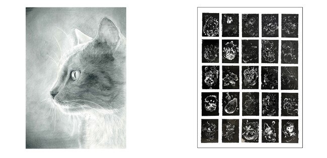 数年前から通称「写実デッサン」と言われている写真のようなデッサンに興味を持ち、人物デッサンを主に模写していました。今回の作品は猫ですが、もともと猫を飼っていたため非常に思い入れがあり、選んで頂けてとても嬉しく思います。ありがとうございました。