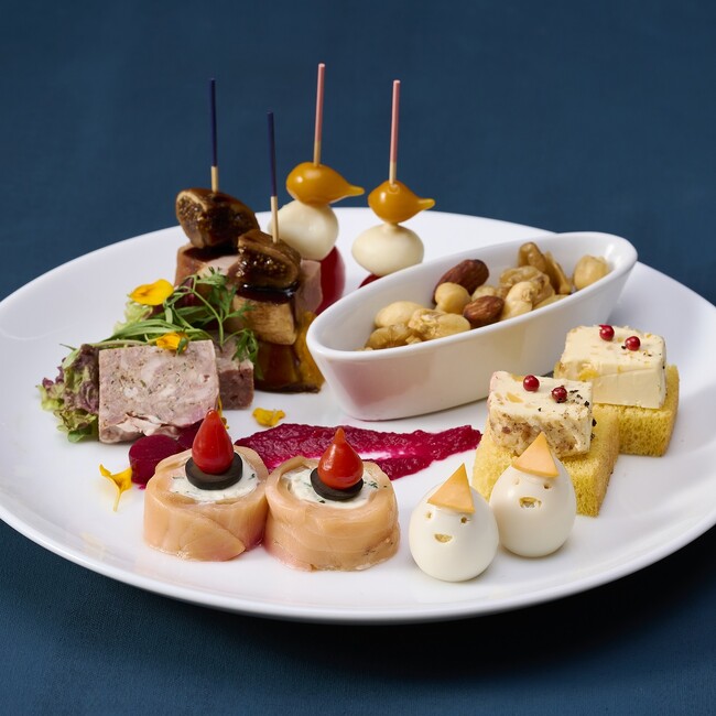 カプレーゼのピンチョス、かぼちゃテリーヌと鴨のピンチョス、パテ・ド・カンパーニュ、サーモンとクリームチーズのファルシ、うずら玉子おばけ、かぼちゃブレッドとアーモンドチーズ、ビーツのピューレ、ミックスナッツ