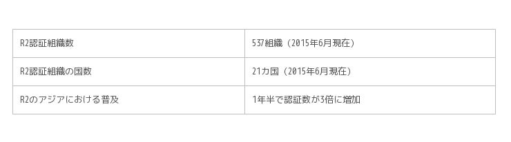 R2は2008年に発行されて以来、米国を中心にさまざまな地域で認証取得されています。