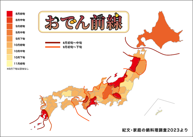 「紀文・鍋白書2023〜前編〜」では、昨年から開始した「紀文・47都道府県 家庭の鍋料理調査2023」の調査結果を発表した。また、昨年の秋冬におでんをいつ食べ始めたのかを『おでん前線』としてまとめました。