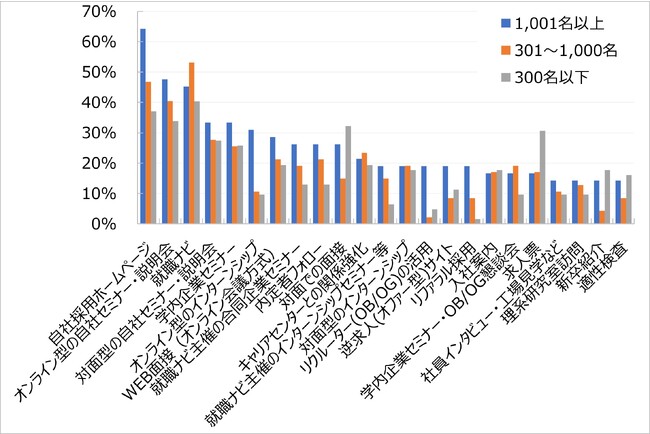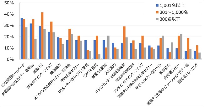 24卒採用で重視した施策について、従業員数1,001名以上の大企業では「自社採用ホームページ」が最多で64%となっており、6割に上っている。これに次いで「オンライン型の自社セミナー・説明会」が48%、「就職ナビ」が45%などとなっている。301〜1,000名の中堅企業や300名以下の中小企業では「就職ナビ」が最も高く、それぞれ53%、40%となっている。これに次いで「自社採用ホームページ」(47%、37%)、「オンライン型の自社セミナー・説明会」(40%、34%)などが挙がっている。